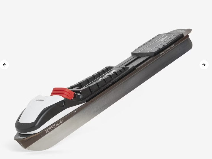 The Torne BC is a new, solid skate with a 28 m skating radius. Great ice clearance, a slightly longer nose and radius make the TORNE BC a skate that performs well also on rough ice. Delivered with a mounted Rottefella Backcountry binding with an extra stiff flexor developed specifically for Nordic skating. The skate is sharpened and ready to use out of the box. Made in Sweden using recycled Swedish stainless steel and low carbon footprint aluminum. 100% recyclable. Redesigned, solid construction. The stainless steel blade is attached to the aluminum profile using both press fit and stamping. The slightly longer nose and 28 m skating radius will bring you comfortably also through the rough parts of your day trip. Available in two lengths, 41 cm (boot size 36-40) and 44 cm (boot size 41-45). Each size is designed to position your foot correctly in relation to the blade for a straightforward skating experince. 1,4 mm blade width is perfect for natural ice conditions in Scandinavia.