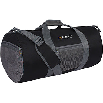 Round body duffles, great for gym or travel. Detachable padded shoulder strap, side wet/dry pocket, mesh front pocket. Neoprene wrapped handle for comfort. Slot side pocket. Packaged in a reusable pouch.